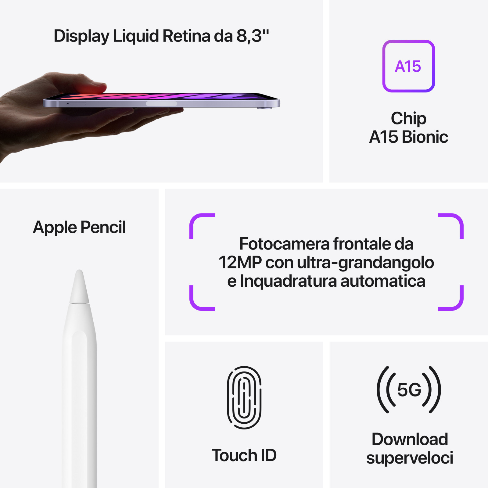 | Display Liquid Retina da 8,3″ con ampia gamma cromatica | Dimensioni schermo: 21,1 cm (8.3″) |